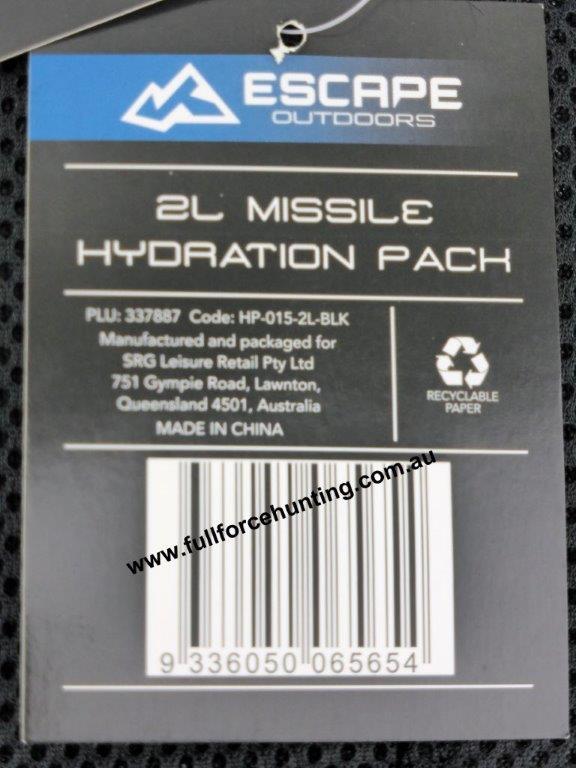 - The Black Escape 2L Missile Hydration Water Bottle Backpack Pack is ideal for hiking, day trips and fitness activities