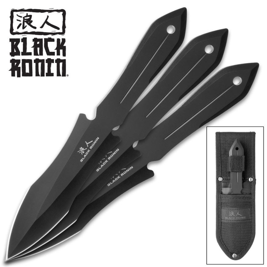 Balance and precision are the hallmarks of high quality throwing knives and the Black Ronin Triple Throwing Knife Set is the epitome of perfection. Each of the throwing knives is crafted of a solid piece of 3Cr13 black coated stainless steel with a 4” blade. The slim, aerodynamic handles give you the correct grip to improve your throwing skills. The set of three knives fit securely in a nylon belt sheath with PVC pocket liners. You’ll be amazed at how much your aim and penetration improves with the Black Ronin Triple Throwing Knife Set.